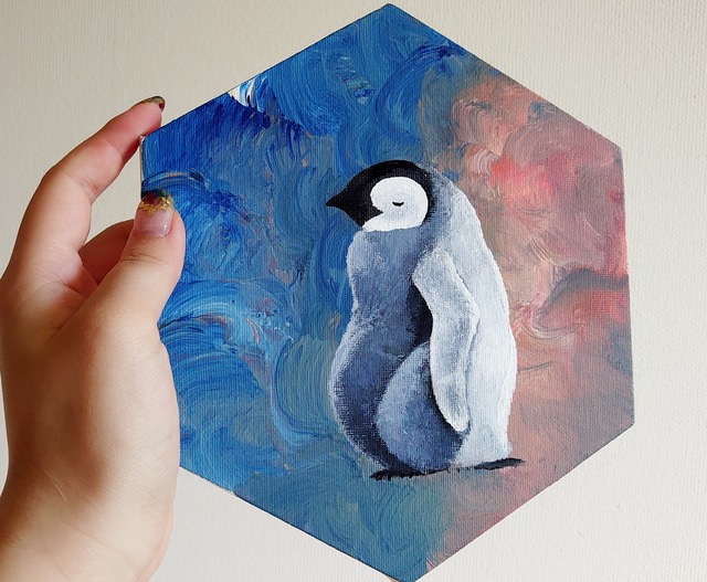 キャンバスにアクリル絵の具で描いたコウテイペンギンのヒナです。 サイズは画像の四枚目を参照ください。
