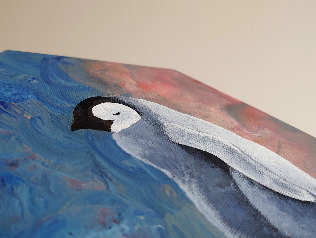 キャンバスにアクリル絵の具で描いたコウテイペンギンのヒナです。 サイズは画像の四枚目を参照ください。