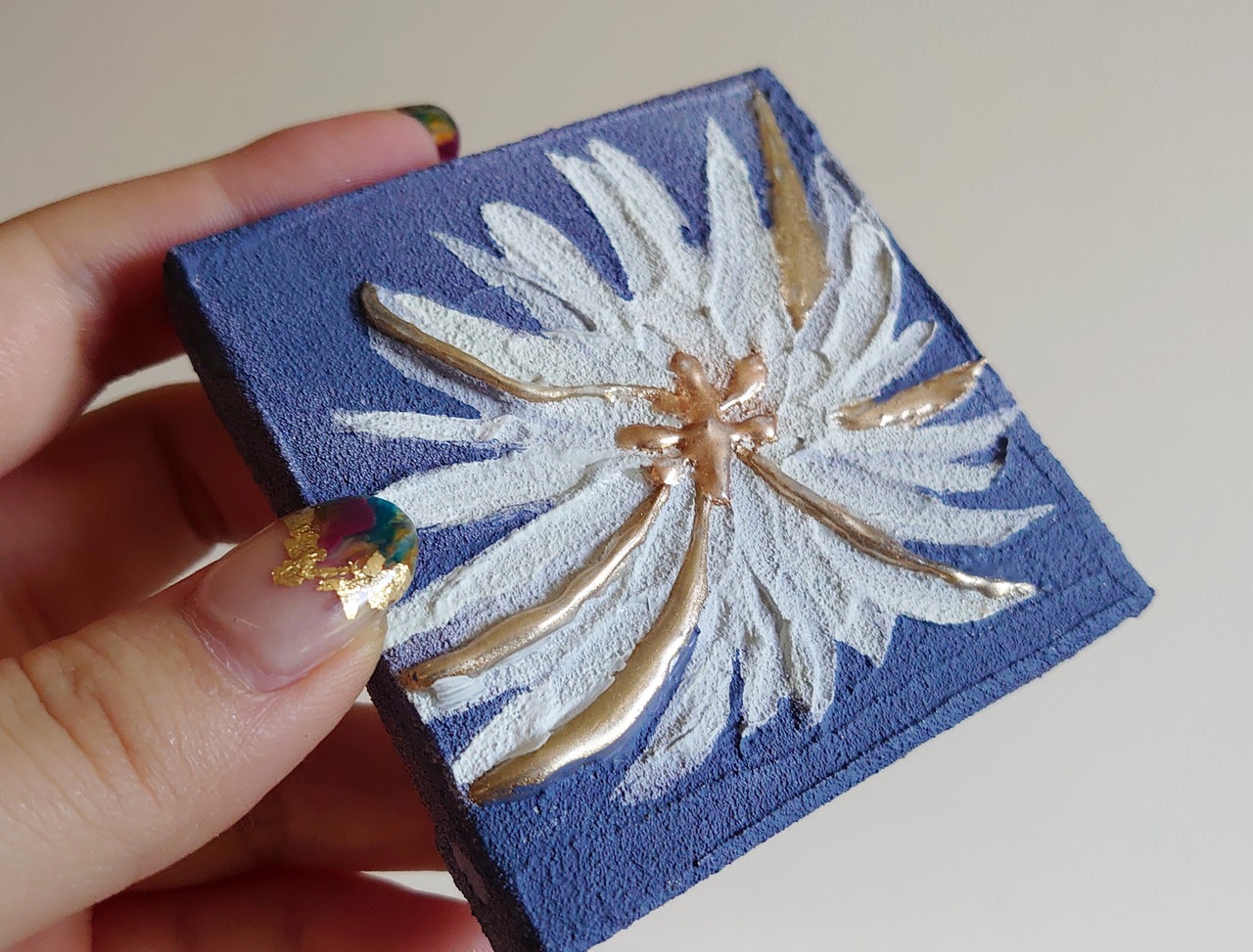 サイズ:7.5×7.5cm 画材:キャンバスにアクリル絵の具、金色の箇所のみ樹脂コーティングしております 個性的で媚ない白い蓮の花を描きました