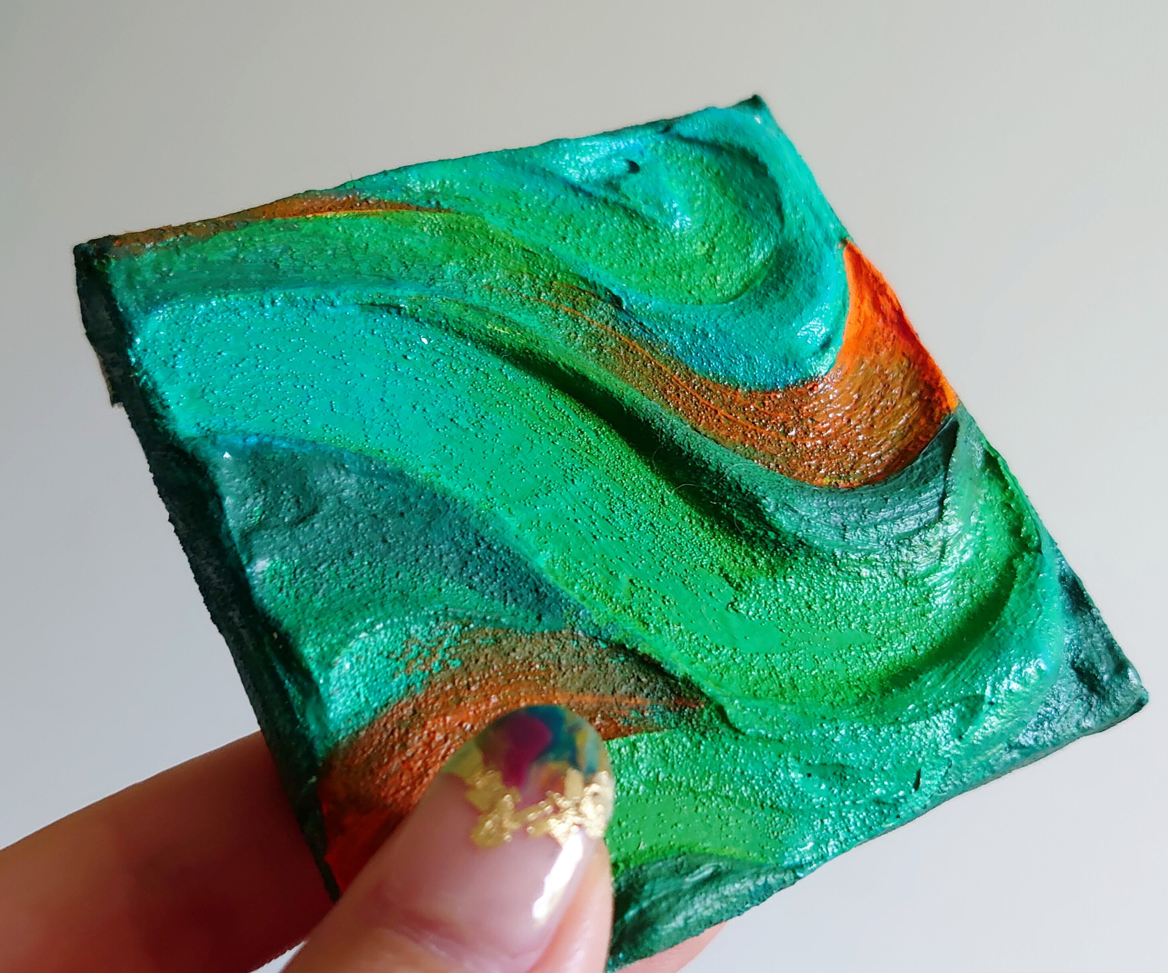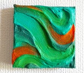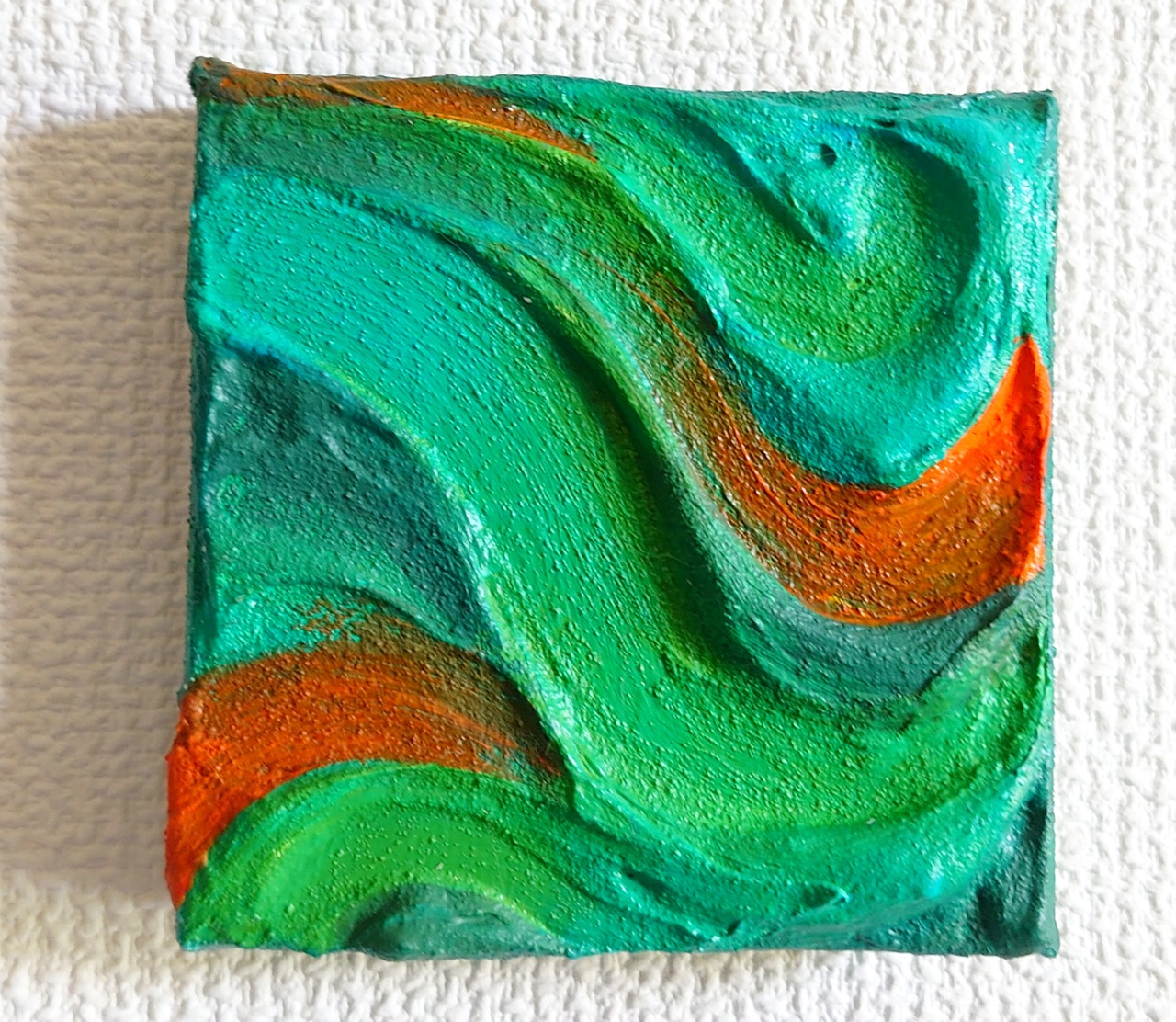 サイズ:7.5cm×7.5cm 画材:キャンバスにモデリングペースト、ジャッソ、アクリル絵の具で描写 熱帯の葉が生い茂る森の生命力を表現しました