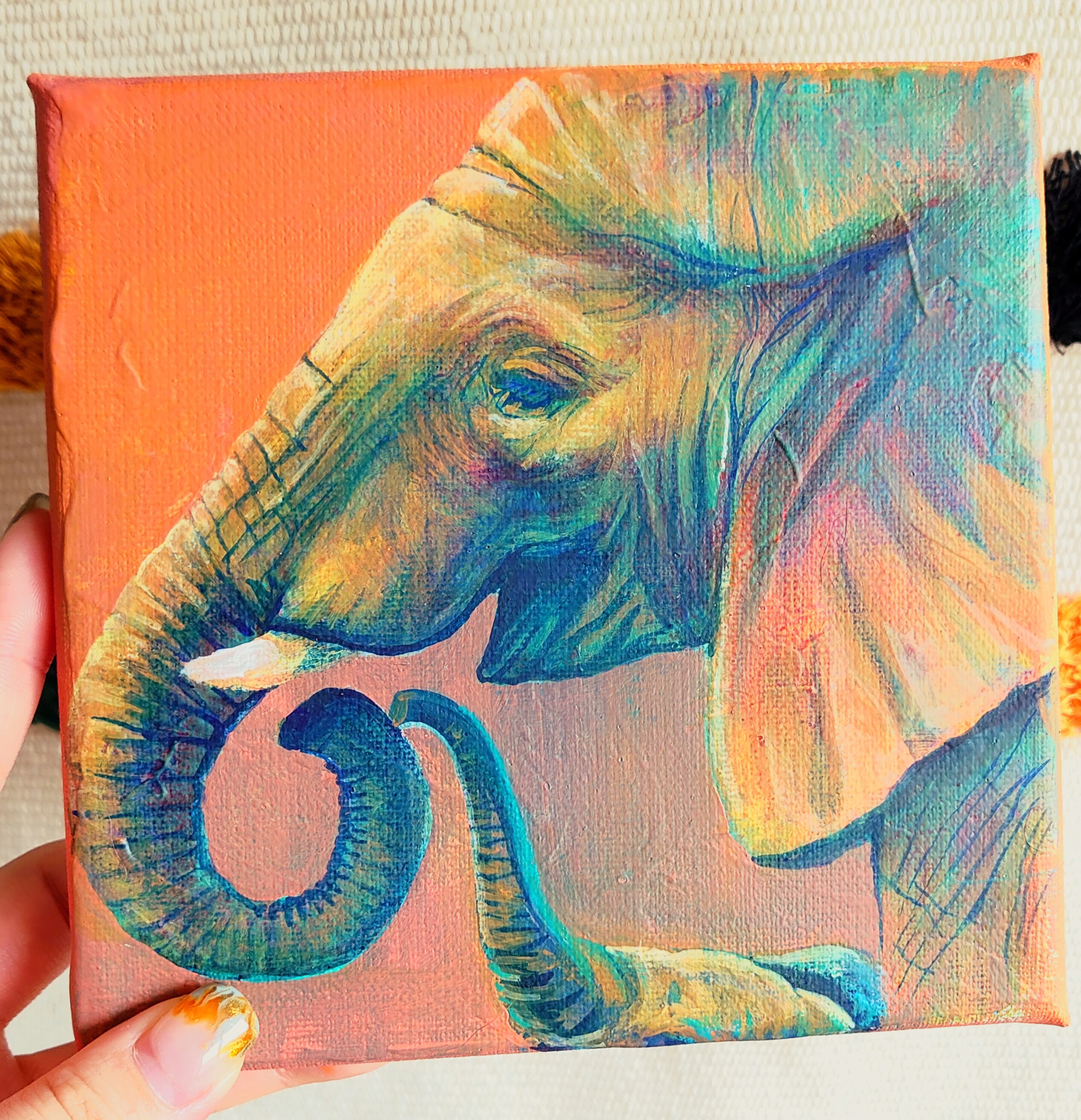 画材:張りキャンバス アクリル絵の具 大きさ:15×15cm アフリカゾウの親子の優しい風景を柔らかい虹色で表現しました