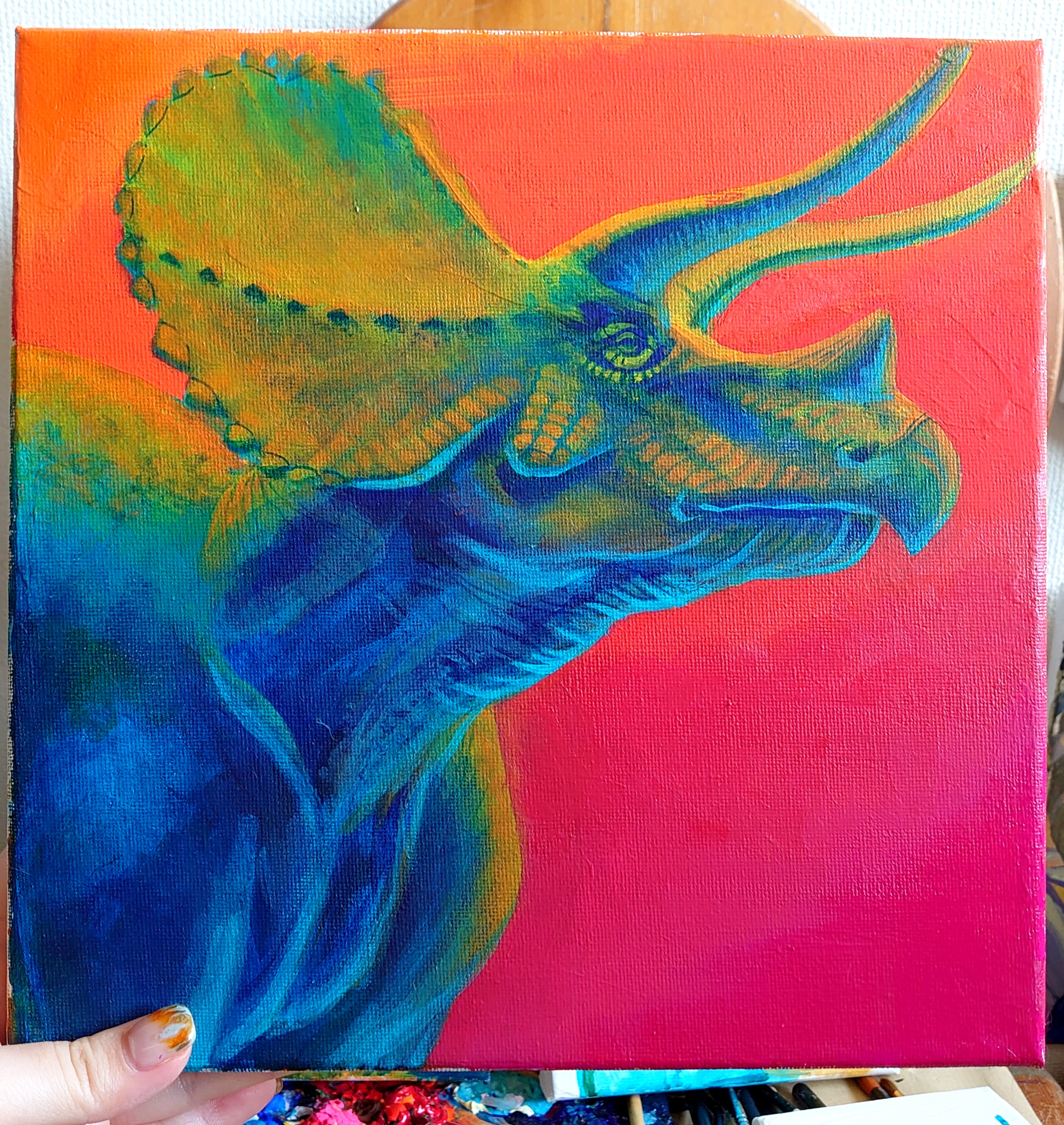 画材:張りキャンバス アクリル絵の具 サイズ:20×20cm ギラギラ力強いトリケラトプスの生命力を極彩色で表現しました